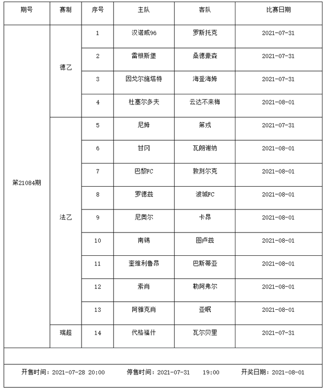 我中心制定了2021年中国足球彩票胜负游戏(14场、任选9场)、6场半全场胜负游戏和4场进球游戏7月30日-8月5日的竞猜场次安排(具体附后),其竞猜对象、开售时间、停售时间和计奖时间均以本文为准。