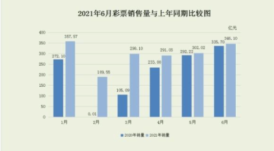 据财政部7月30日消息,2021年6月份全国彩票销售情况今日公布。6月份,全国共销售彩票346.10亿元,比上年同期(简称“同比”)增加10.40亿元,增长3.1%。1-6月累计,全国共销售彩票1784.38亿元,同比增加545.38亿元,增长44.0%。