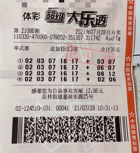 7月28日,体彩大乐透第21086期开奖,开奖号码为“02 03 07 16 17,06 10”,位于宁波市奉化区岳林街道惠政东路25号的3302124510体彩实体店中出6注追加二等奖,单注总奖金31.78万元。