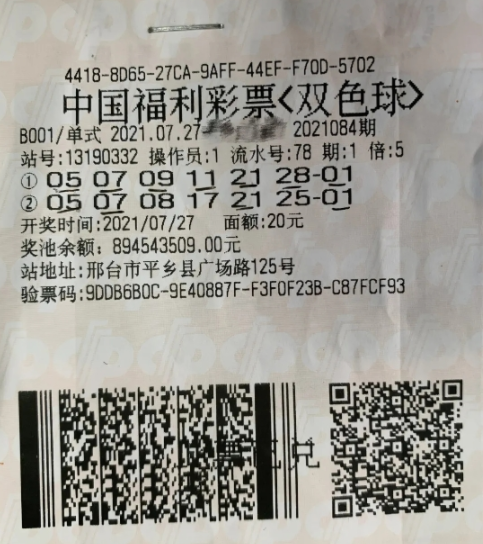 7月27日,双色球第2021084期,邢台市平乡县广场路13190332站一位购彩者5倍投注2注单式号码,收获一等奖5注、五等奖5注,奖金合计2907.1775万元。7月29日上午,大奖得主在大女儿和女婿陪同下领奖。