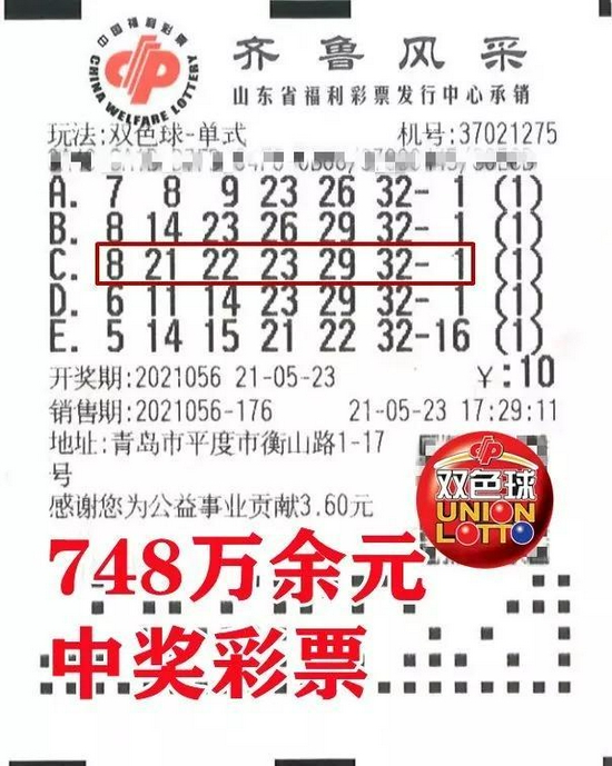 双色球第2021056期开奖,一等奖开出10注,单注奖金7488306元,青岛中出省内唯一1注头奖,大奖彩站是位于平度市衡山路1-17号的福彩37021275销售站,大奖彩友正是付先生(化姓)。他凭借一张投注额10元的双色球自选单式票,在中得1注一等奖的同时,还中得1注四等奖和2注五等奖,中奖金额合计7488526元!