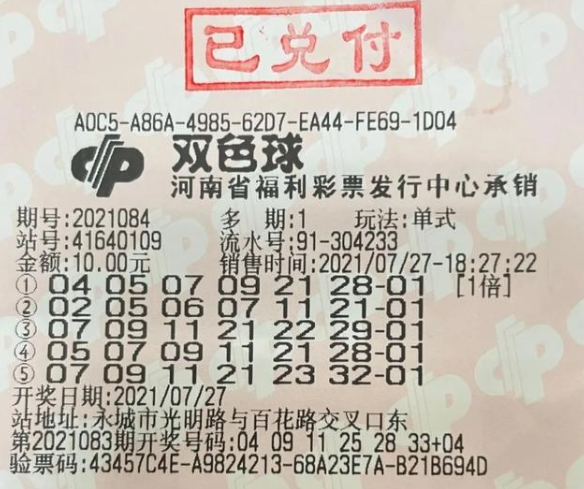 7月27日晚,福彩双色球第2021084期开出头奖21注,单注奖金为581万多元,其中河南彩民收获1注,出自永城市光明路百花路东41640109福彩投注站,为一张单式5注10元票,中奖金额581万元,这也是河南彩民今年收获的第37注双色球一等奖,再现大奖福地。