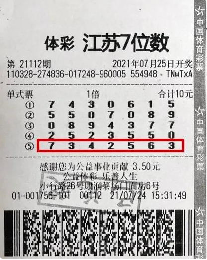 7月25日,江苏体彩7位数第21112期开出中奖号码7342563,南京3201001756网点购彩者张先生中得特等奖1注,奖金500万元。日前,中奖张先生现身江苏体彩兑奖大厅领奖。