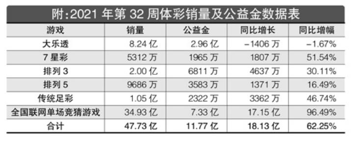 8月2日至8日,体彩全国联销游戏(大乐透、7星彩、排列3、排列5、传统足彩、全国联网单场竞猜游戏)通过47.73亿元的销量,筹集了11.77亿元公益金。当周销量比上年同期增加18.13亿元,增长62.25%。当周共开出7注1000万元及以上大奖,全部出自大乐透。