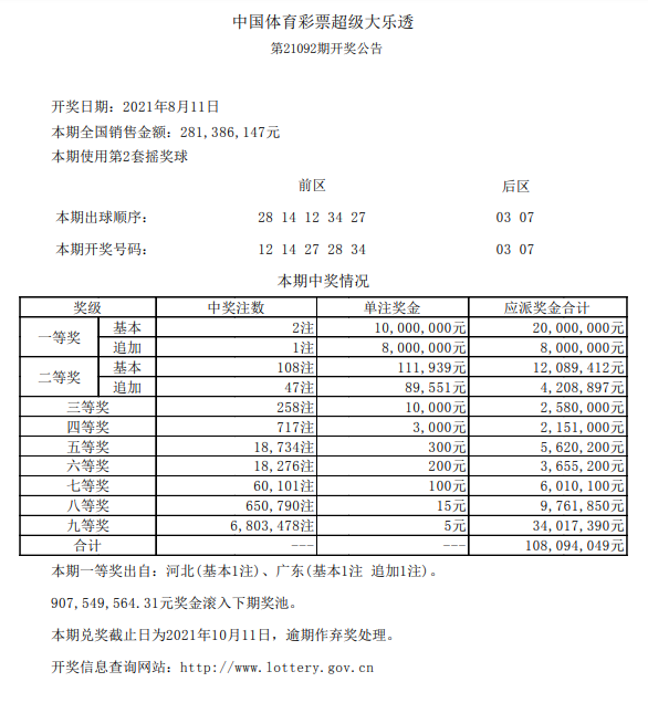 本期全国销售额为2.81亿元。奖池方面,本期开奖结束后,9.07亿余元滚存至8月14日(周六)开奖的第21093期。