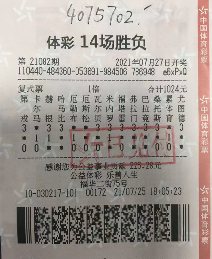7月27日,足彩14场胜负游戏第21082期开奖,位于茂名市茂南区福华二街75号的4410030217体彩实体店传来喜讯,一球迷购买的一张14场胜负复式票,幸运中得当期足彩1注3825610元的一等奖和9注共250092元的二等奖,总揽奖金4075702元,为国家贡献个人偶然所得税815140.40元。