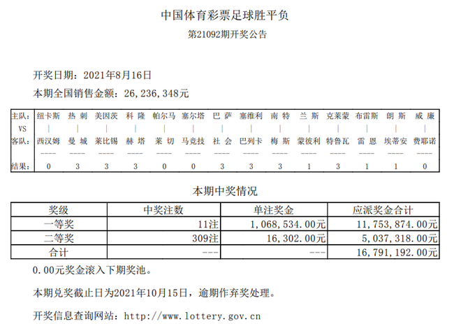 北京时间8月16日,胜负彩第21092期结束全部14场比赛的争夺。本期一等奖开出11注,单注奖金106万元;二等奖开出309注,单注奖金16302元。任九开2167注5743元。当期胜负彩14场销量为26,236,348元,任九投注总额为19,448,058元。
