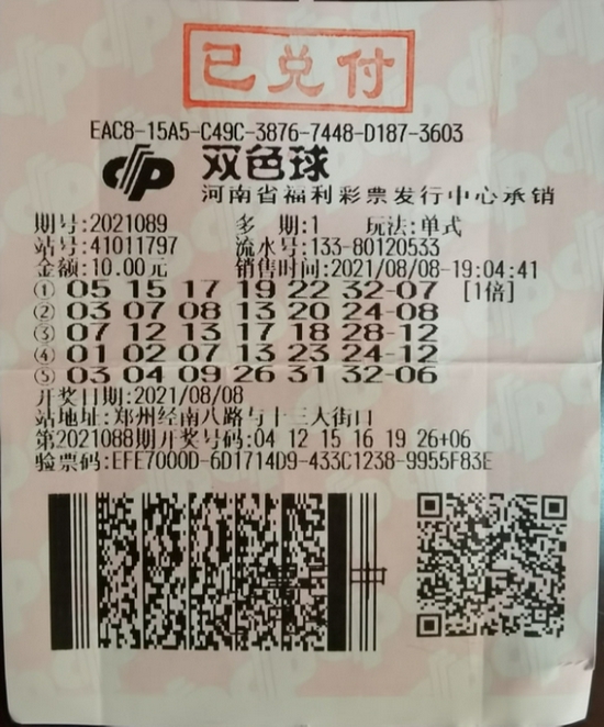 十分好运,张先生收获的双色球一等奖,正是第2021089期的其中1注,出自郑州市管城区经南八路十三大街41011797福彩投注站。据介绍,张先生购彩十多年了,是福彩老彩民,由于自己工作的原因,他经常到外地出差,但这也不妨碍他购彩,“我是走到哪,买到哪,遇到彩票店,我都进去买几注。”