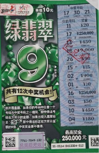 8月15日她如往常一样下班路过1305020087101号代销网点,想起今天7星彩开奖进店购彩,习惯性的刮了几张10元即开票,在中得20元奖金后,没有兑奖,而是看到了柜台里剩余的几张绿翡翠彩票,打算一鼓作气把剩票解决掉,在刮到第三张时,中出了25万大奖,期初王女士并未看清,询问代销者中2.5万大奖去哪里兑奖,将中奖票给代销者看,才发现是中得了25万元一等奖,确认金额无误后,王女士欢喜的回家去了,表示要将这个好消息告诉家人,明天一早去兑奖。