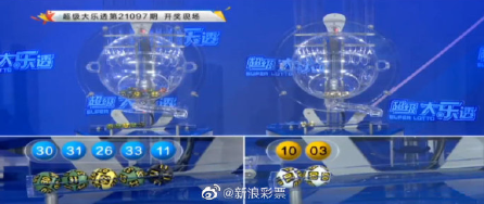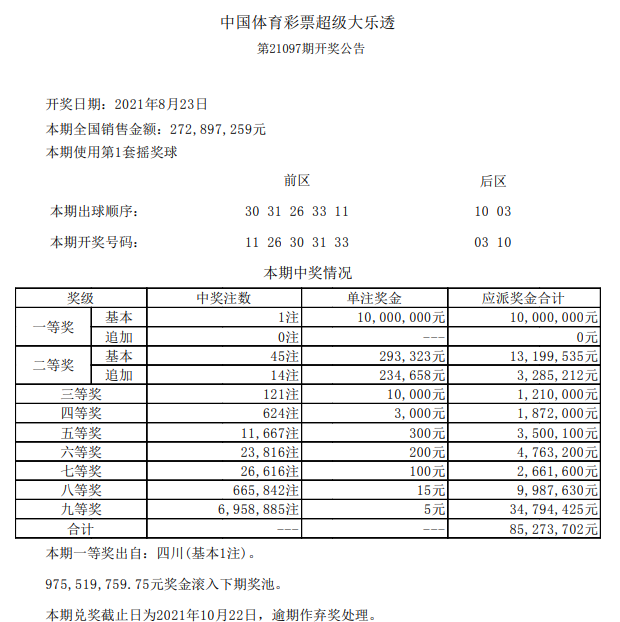 北京时间8月23日晚,体彩大乐透第21097期开奖。当期开奖号码为:前区11 26 30 31 33,后区03 10。