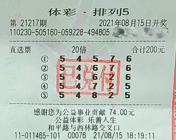8月15日开奖的排列5玩法第21217期,一位佳木斯购彩者凭借倍投直选票,揽获200万大奖,中奖彩票出自佳木斯市和平路与西林路交叉口的2311011465体彩销售网点。