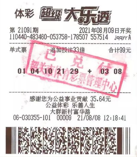 8月9日,大乐透第21091期开奖,开出号码“01、04、10、21、29 + 03、05”。韶关购彩者林先生(化姓)凭借一张投注号码为“01、04、10、21、29 + 03、08”追加33倍彩票,中得二等奖奖金204万,追加投注奖金163万,共擒获奖金367万元,为当地贡献税收73万元。