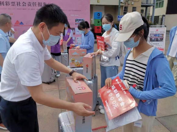 在苍南县灵溪镇公园山广场上,大屏滚动播放着福彩宣传片,传达着福彩对于莘莘学子的关怀和希望。现场为受助的大学新生送上每人一个行李箱、福彩公益宣传品等物品,希望大学新生们可以带着温暖和爱继续在梦想的道路上前行。此外,中国联通鹿城区分公司还为到场的每位学生送上了充电宝和一个学期的话费卡。