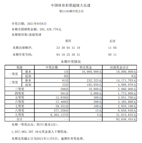 北京时间9月6日晚,体彩大乐透第21103期开奖。当期开奖号码为:04 10 23 30 31,后区:05 11。