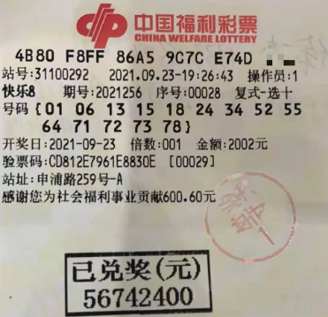 据了解,中奖彩票售出于宝山区申浦路259号-A福彩销售点,该票采用复式投注,投注金额2002元,中奖总金额为56742400元,是目前“快乐8”单票最高奖金!