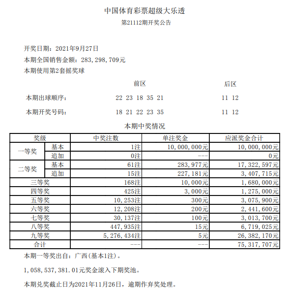 北京时间9月27日晚,体彩大乐透第21112期开奖。当期开奖号码为:前区18 21 22 23 35,后区11 12。