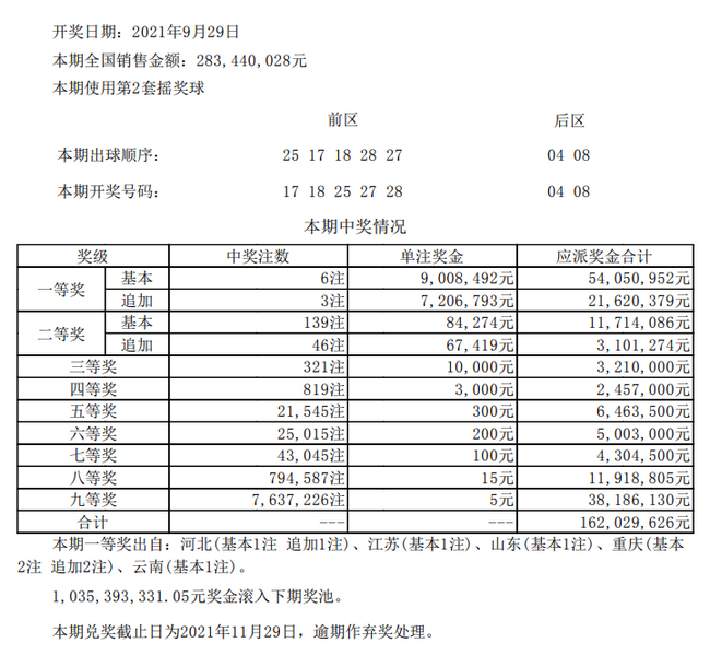 9月29日,超级大乐透第21113期前区开出号码“17、18、25、27、28”,后区开出号码“04、08”。本期全国销量为2.83亿元,为国家筹集彩票公益金1.02亿元。