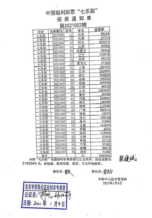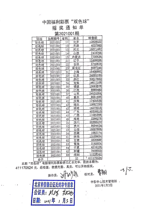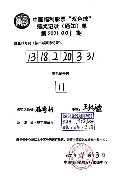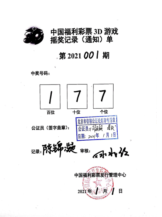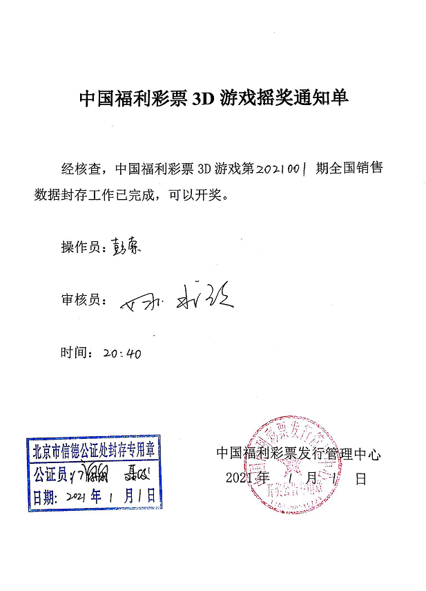 21:24左右,1号演播厅摇奖结束,开奖工作人员与公证人员核对中奖号码,双方同时在摇奖记录通知单上签字并盖章,开奖工作人员将签字盖章后的《双色球(七乐彩)摇奖记录通知单》、《中国福利彩票3D摇奖记录(通知)单》传送至各省级福彩机构。