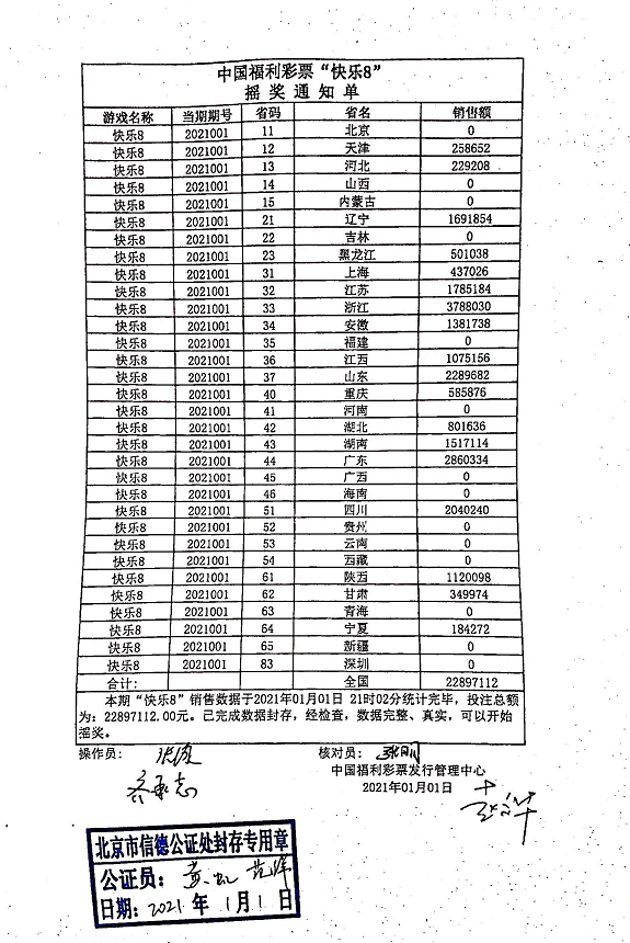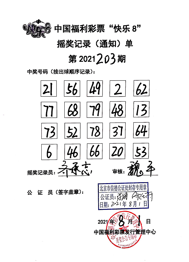 21:36左右,2号演播厅摇奖结束,开奖工作人员与公证人员核对中奖号码,双方同时在摇奖记录通知单上签字并盖章,开奖工作人员将签字盖章后的《中国福利彩票“快乐8”摇奖记录(通知)单》传送至各省级福彩机构。