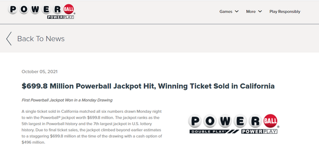 近日据美国媒体报道,在10月4日周一晚的强力球(Powerball)彩票开奖中,爆出了高达6.998亿美元(约合人民币45.1亿元)超级巨奖!10月5日,官方公布了部分中奖信息,此次巨奖出自加利福尼亚州,是强力球彩票史上的第5大巨奖,同时也是美国彩票史上的第7大巨奖。