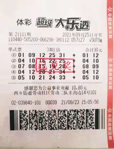 9月25日,在体彩大乐透第21111期开奖中,思先生通过一张经3期连投的、5注号码、30元投入的单式票,中出1注714万元一等奖。