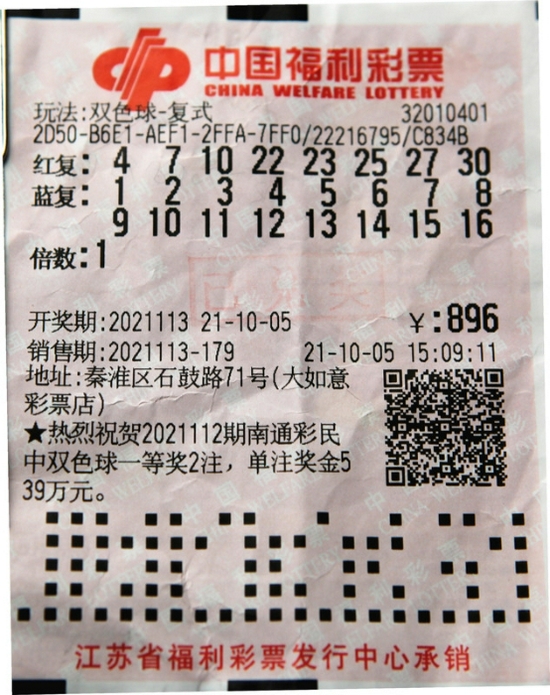 当期江苏省幸运的中奖彩民来自南京市,该彩民于2021年10月5日15时09分11秒,在南京市秦淮区石鼓路71号(大如意彩票店),编号为32010401的福彩销售网点,花费896元,以蓝球全复式投注的方式购得448注彩票,其中1注与当期开出的中奖号码完全一致,收获一等奖1注,二等奖15注,三等奖12注,四等奖195注和五等奖225注,奖金共计780万多元。