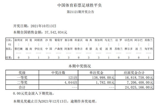 沙特3-2中国北京时间10月13日,胜负彩第21121期开奖结果揭晓。本期足彩14场头奖开121注13.8万元,二等开出4044注1782元;任九头奖开出18632注501元。本期足彩14场投注总额为37,542,034元,任九投注总额为14,605,670元。