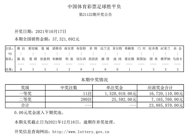 北京时间10月17日,足彩第21122期开奖结果揭晓。本期足彩14场头奖开11注,单注奖金152万元;二等开出280注25592元;任九开出2548注6145元。本期足彩14场投注总额为37,321,692元,任九投注总额为24,464,922元。