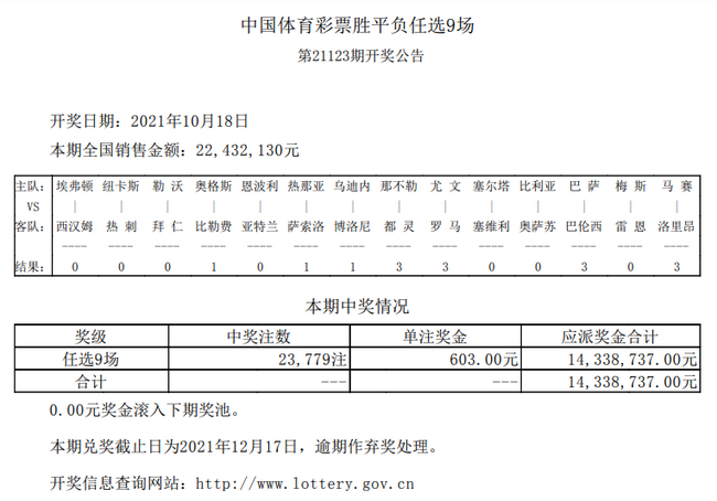巴萨逆转取胜北京时间10月18日,足彩第21123期任九开奖结果产生。本期任九开出23779注,单注奖金603元;任九投注总额为22,432,130元。
