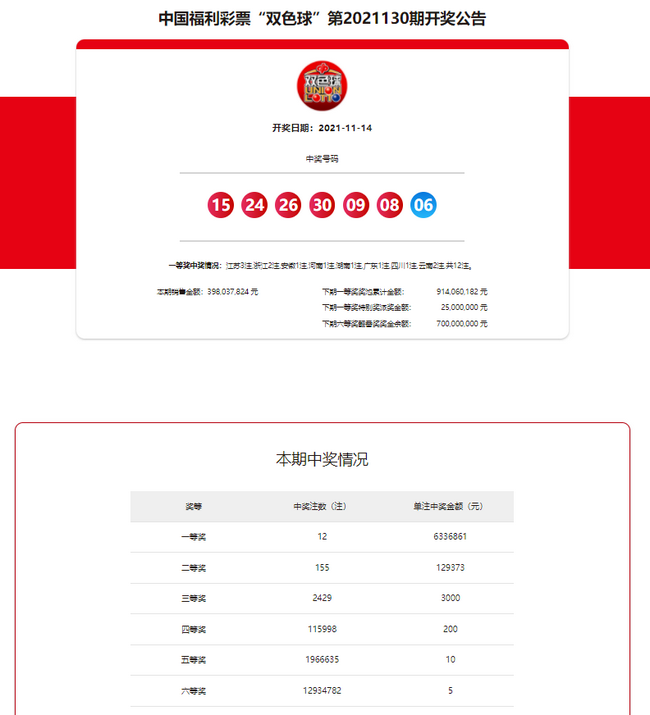福彩开奖北京时间2021年11月14日,福彩双色球第21130期开奖。值得注意的是,双色球21年度大派奖活动将于下期正式开启(21131期),本次活动预计持续20期,派奖总金额为12亿元,其中包括一等奖特别奖5亿元,以及六等奖翻番奖7亿元。