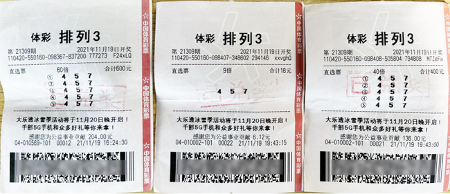 开奖当天下午,杨先生走进武汉10166体彩销售点,将这注排列5号码投注了130倍,随后在另外一个销售点将“457”排列3投注了300倍。停售前他又走进10002体彩销售点将这注排列5号码再次投注了11倍,将排列3号码投注了209倍。没想到这一连串“全对”的操作,就此为他带来超级幸运。