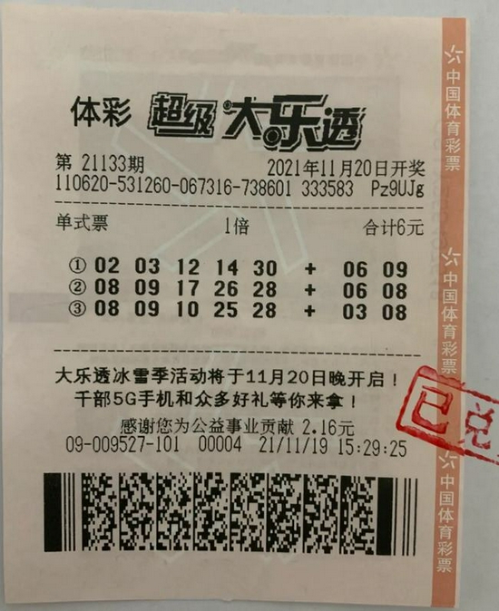2021年11月20日晚,超级大乐透第21133期开奖,本期前区开出号码“08、09、17、26、28”,后区开出“06、08”,本期全国共开出13注一等奖,其中追加7注,其中一注基本投注幸运降临定西市岷县张先生(化姓),这张中奖彩票是3注单式基本投注,票面金额6元,其中一注就擒获了本期的一等奖,奖金669万元。
