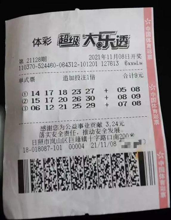 11月8日,体彩大乐透第21128期开奖,山东日照一购彩者凭借一张投注金额为9元的3注单式票一举中得追加投注一等奖1注,喜获奖金1378万元。
