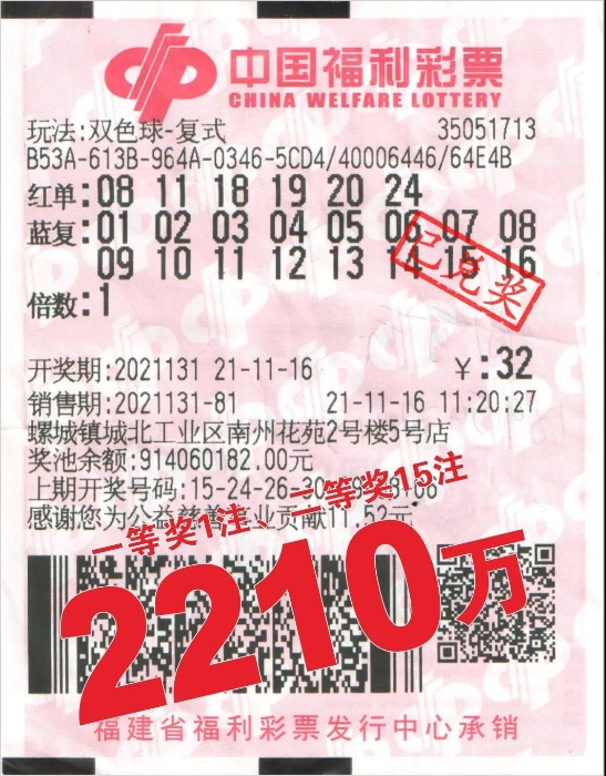 胡先生的这张中奖彩票,是一张6+16的全蓝复式票,是在泉州市惠安县螺城镇城北工业区南州花苑2号楼5号店的福彩35051713投注站买的,不仅中得1注1778.7130万元的一等奖,还中得15注单注奖金为28.7961万元的二等奖,总奖金高达2210万元!中奖方式与第2021129期南安水头的920万元的如出一辙,均为6+16全蓝复式票。