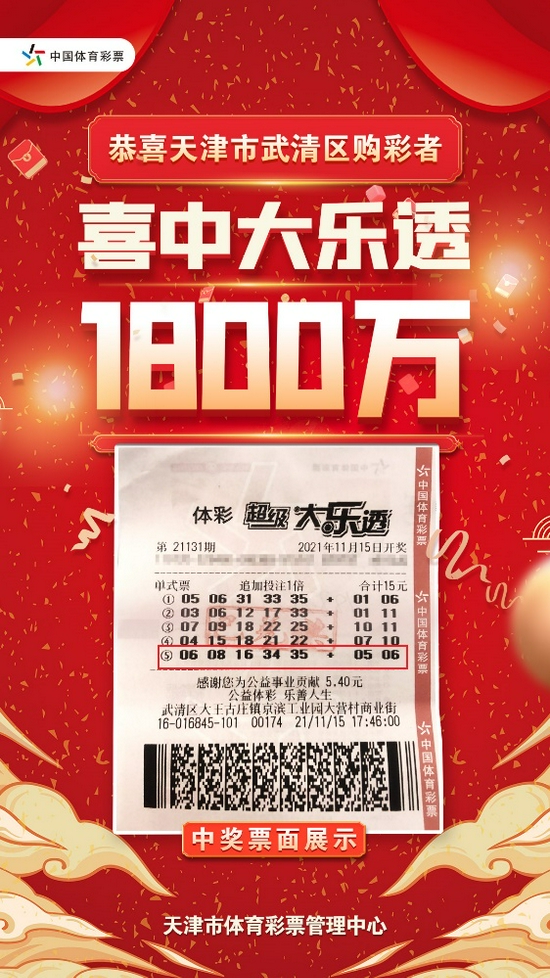 11月真的是一个神奇的月份,津门大地仿佛开挂一般,接连斩获大奖!首先是11月1日晚,来自宝坻区的购彩者喜中体彩“排列5”2500万大奖,之后仅仅时隔两周,11月15日晚,第21131期大乐透再次为津门大地送上惊喜,来自武清区的一位购彩者喜中大乐透追加一等奖1注,获奖金额1800万元。近日,武清区的这位中奖者携妻子一起现身天津体彩中心办理了兑奖手续。