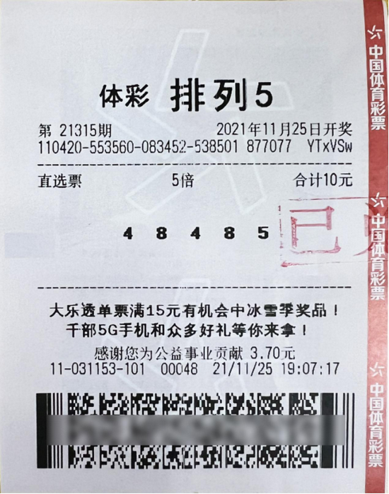 据肖女士说,她和黄冈31153体彩销售点老板是老熟人了,每次都是去他们家购彩。11月25日晚上,肖女士还是照常到体彩店看了一下走势图,考虑一下后便选定了“48485”这组排列5号码。到了晚上9点,肖女士接到彩票店老板电话时,还奇怪这么晚有什么事嘛,结果老板带来的是她中大奖的好消息。肖女士刚开始还不相信,于是查了查开奖结果,发现自己果真中了大奖。