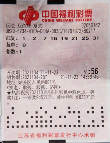 当期我省喜中1注一等奖,幸运站点是苏州市姑苏区人民路801号、编号32050162销售网点,这是一张自选“8+1”红球复式票,花费56元,销售日期是11月23日14时53分45秒,总计中得一等奖1注、三等奖12注、四等奖15注,由于正处于双色球12亿大派奖活动期间,该票符合派奖规则,另获得一等奖特别奖1注,单注奖金312万多元,总计收获奖金1065万多元。