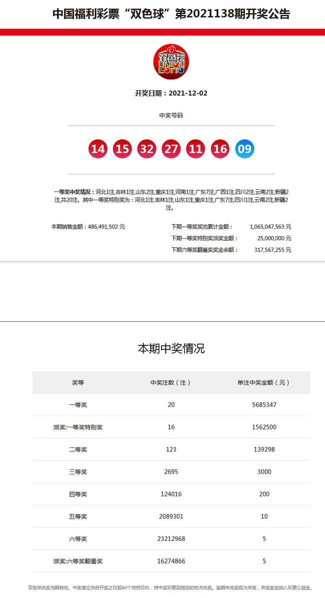 北京时间12月2日,福彩双色球迎来第21138期开奖,同时本期还是双色球12亿大派奖的第8期。当期开奖号码为红球11 14 15 16 27 32,蓝球09。本期一等奖开出20注,其中一等奖特别奖16注。另外,本期销量达到4.86亿,位列双色球历史单期销量排行第5位。