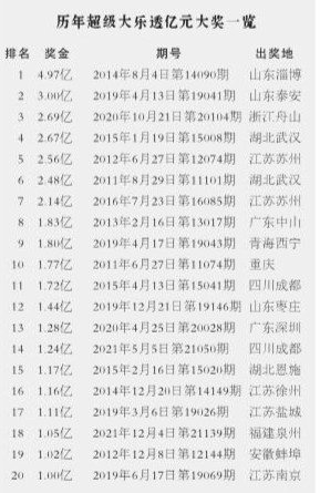 值得一提的是,数据显示,福建泉州中出的10注1050万元全部出自同一体彩实体店,中奖彩票为一张1注号码、10倍投注、30元投入的单式追加倍投票,单票擒奖1.05亿元,成为超级大乐透历史上中出的第20个亿元大奖,目前排名第18位。