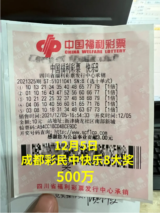 12月5日,福彩“快乐8”第2021325期开奖,全国开出“选十中十”大奖1注,单注奖金为500万元。这唯一的1注“选十中十”大奖就落在了四川。