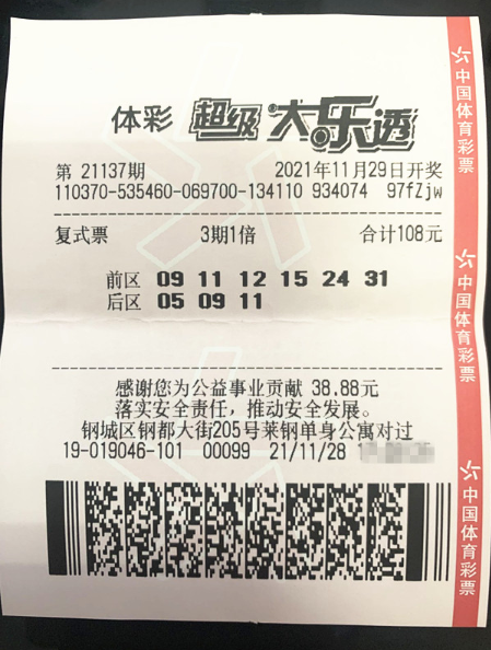 12月1日,超级大乐透第21138期前区开出号码“09 11 12 15 31”,后区开出号码 “05 11”。当期全国共开出4注一等奖,其中1注花落济南。济南钢城区购彩者凭借一张多期投注的“6+3”复式票,幸运揽获大乐透第21138期一等奖1注、二等奖2注、四等奖5注、五等奖10注,共收获奖金10383440元。