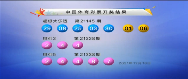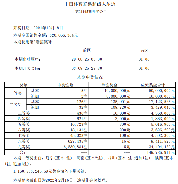 北京时间12月18日晚,体彩大乐透第21145期开奖。当期开奖号码为:前区03 08 25 29 30,后区01 06。本期一等奖开出5注,单注奖金1000万元。其中2注选择追加,多得800万元奖金,2注追加头奖分落四川、陕西,基本头奖落于辽宁1注、河南2注。