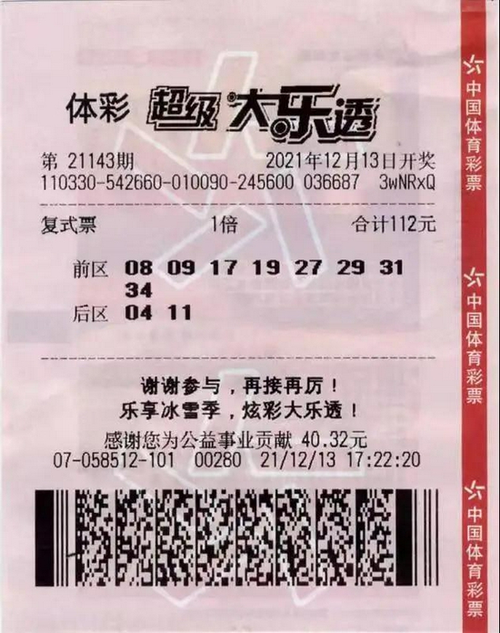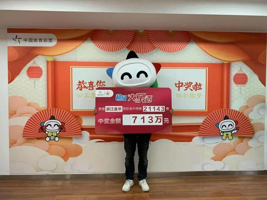 12月13日,体彩大乐透第21143期开奖,当期全国中出11注一等奖,单注奖金708万元,我省金华购彩者喜揽1注。这注一等奖出自金华市武义县白洋街道宝塔路157号润华名座一楼店面的3307058512体彩实体店,票面为一张投注金额112元的8+2复式票。