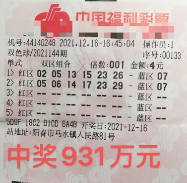 12月16日,中国福利彩票第 2021144 期开奖,开出号码是26、13、15、02、05、23—07,全国中出一等奖5注,单注奖金达931万元。其中一注是在阳江市阳春马水镇人民路81号44140248福彩投注站中出。当晚,阳江福彩市场一片哗然:三个月前,该镇刚中出一个双色球一等奖,现在又中出一个,这名幸运儿到底会是谁呢?