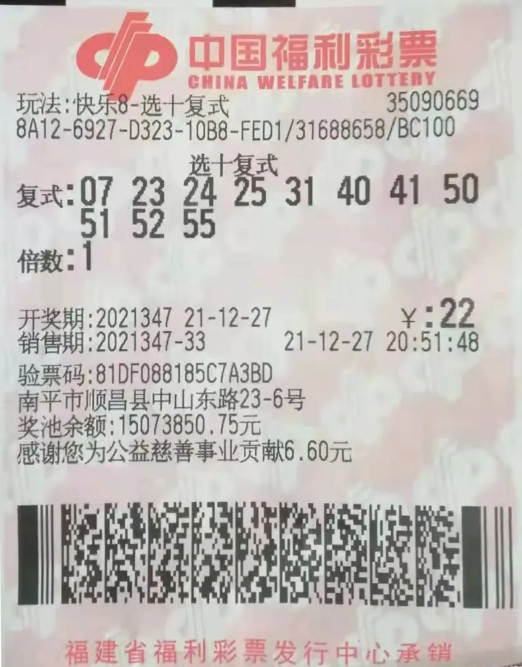 12月27日晚开奖的快乐8第2021347期,全国中出2注单注奖金500万元的“选十中十”。福建喜获其中1注,花落南平市顺昌县中山东路23-6号的福彩35090669投注站。中奖彩票是一张11个号码的复式票,击中10个开奖号码,不仅中得1注“选十中十”,还中得10注单注奖金为8000元的“选十中九”,总奖金高达508万元!这是南平的第1注、福建的第8注快乐8“选十中十”大奖!