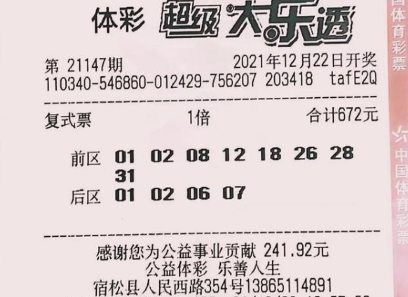 据媒体报道,在体彩大乐透第21147期开奖中,当期全国共开出了4注一等奖,单注奖金为1000万元,其中一注大奖花落安徽省安庆市宿松县人民西路354号体彩投注站,中奖彩票是一张672元投入的8+4复式票,凭此票中得奖金累计高1078万余元。