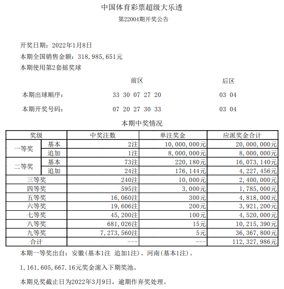 大乐透开奖号码北京时间1月8日晚,体彩大乐透第22004期开奖。当期开奖号码为:前区07 20 27 30 33,后区03 04。
