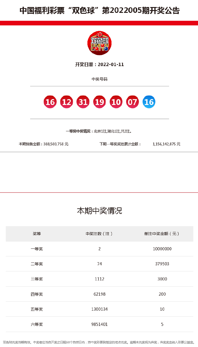 北京时间2022年1月11日,福彩双色球迎来第22005期开奖,当期奖号为红球:07 10 12 16 19 31,蓝球16。本期头奖开出2注1000万,双色球销量为3.88亿元,计奖结束后奖池余额11.56亿元。