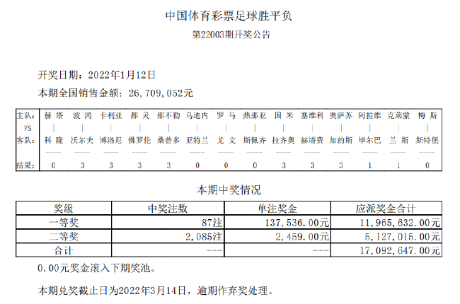 卡利亚里2-1博洛尼亚北京时间1月12日,胜负彩第22003期终于结束全部比赛的争夺,本期一等奖开出87注,单注奖金13.7万元;二等奖开出2085注,单注奖金2459元,任九开12221注926元。本期胜负彩销量为26,709,052元,任九投注总额为17,682,870元。至此,在2022年延期的3期足彩,最终于今日一并开奖!