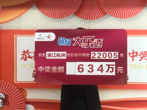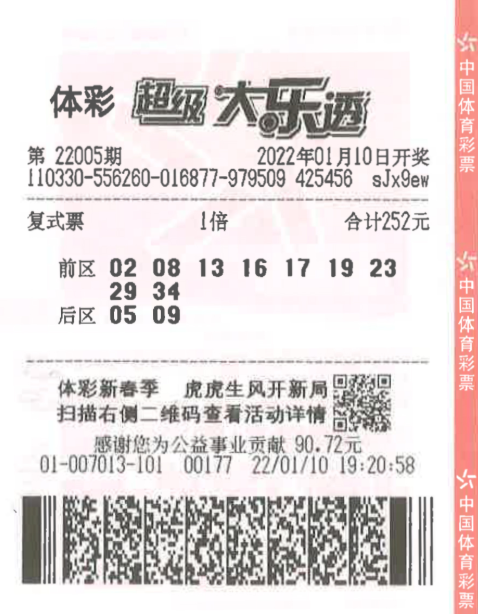 1月10日,体彩大乐透第22005期开奖,本期开奖号码为:前区02、13、17、19、34 ,后区05、09。我省杭州购彩者凭借一张“9+2”复式票,揽获一等奖1注、四等奖20注和其它奖级若干,共揽得奖金634万元。